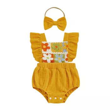 Summer Baby Girl Crochet Flower Romper with Headband – Flying Sleeve Bodysuit
